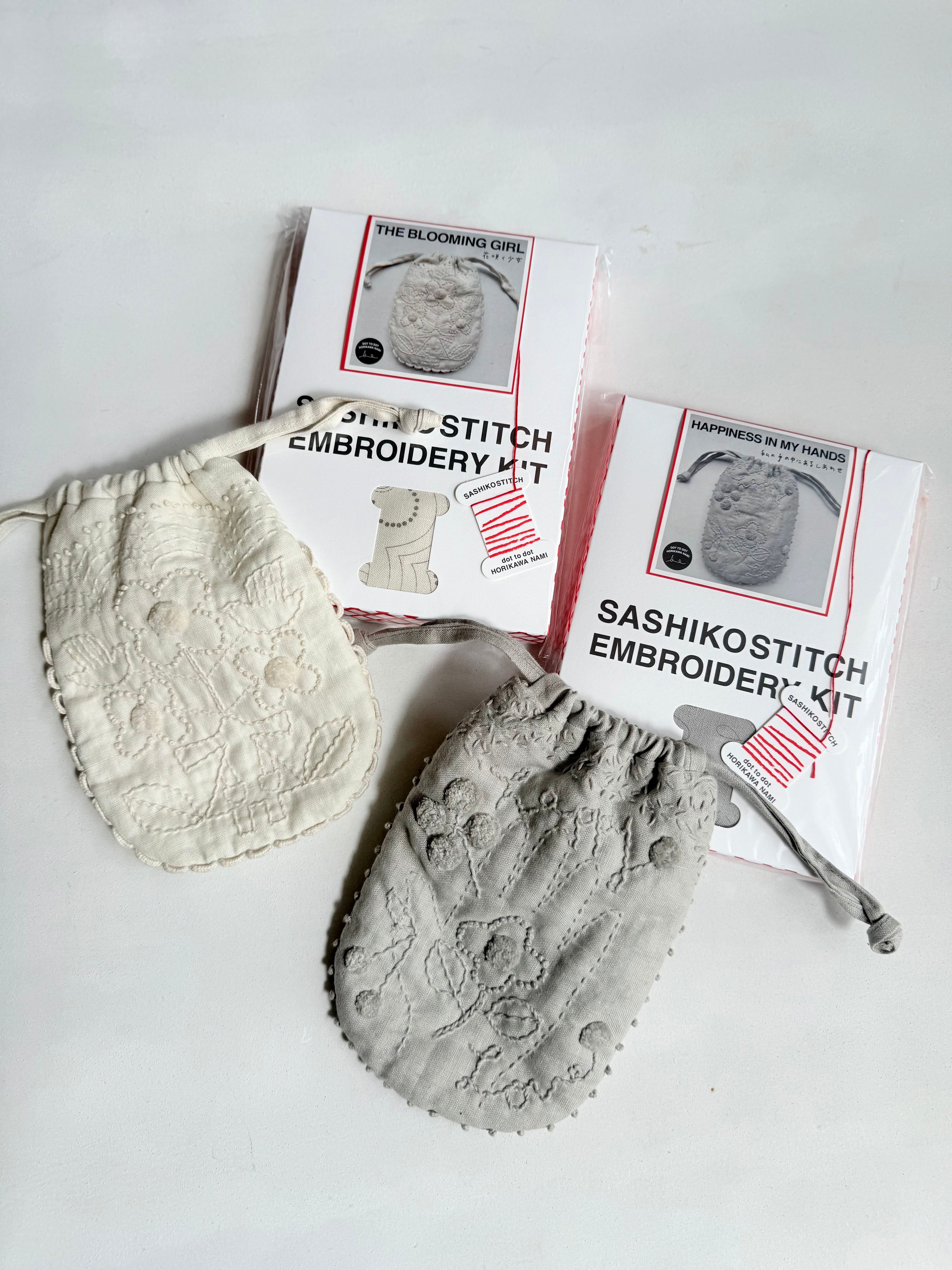 両面ふわふわのキルト芯入りの「SASHIKOSTITCH PON PON KINCHAKU KIT」は、堀川波オリジナルのイラストを刺し子ステッチで仕上げ、かわいらしいデザインの巾着を手作りできるキットです。