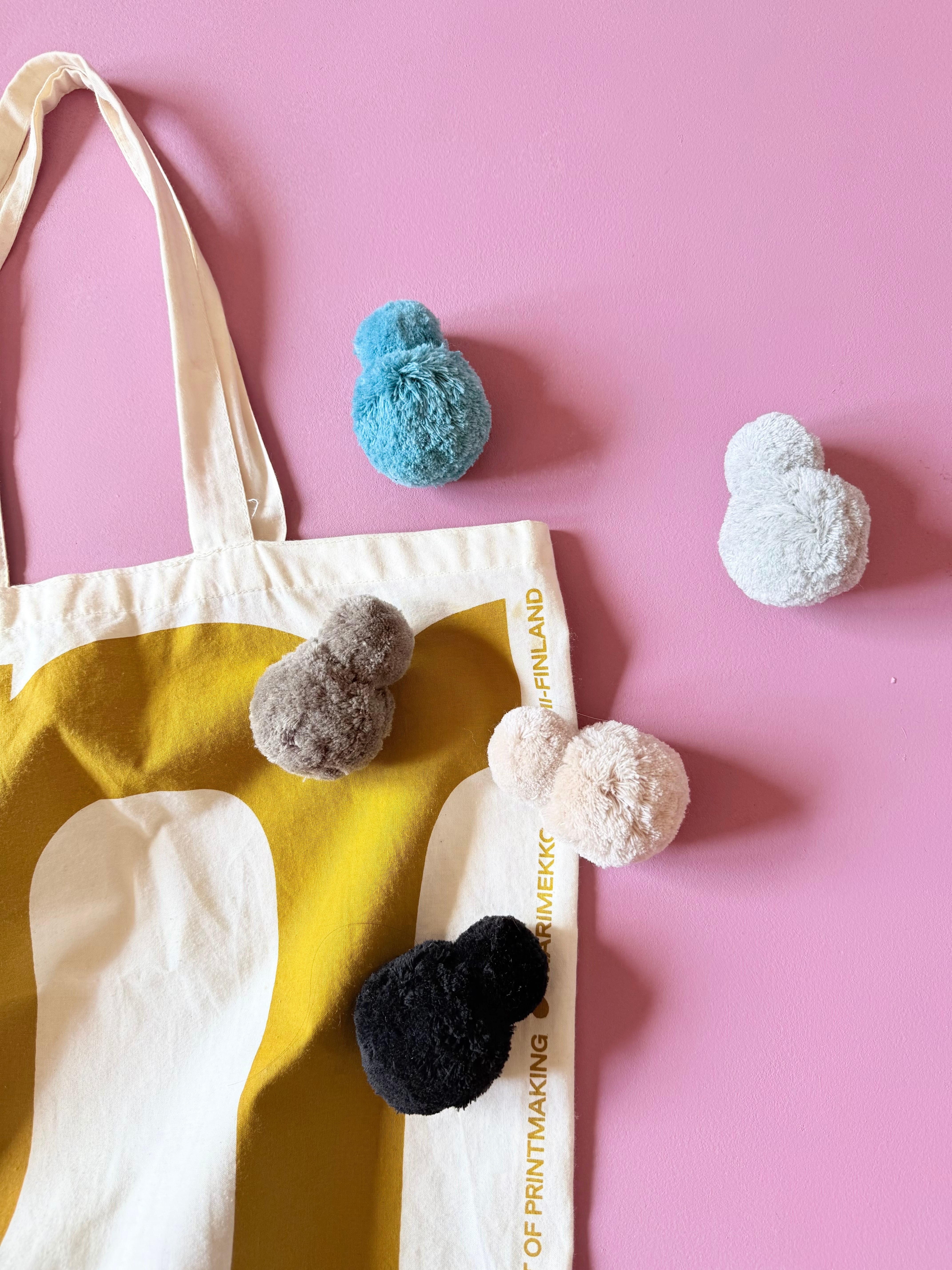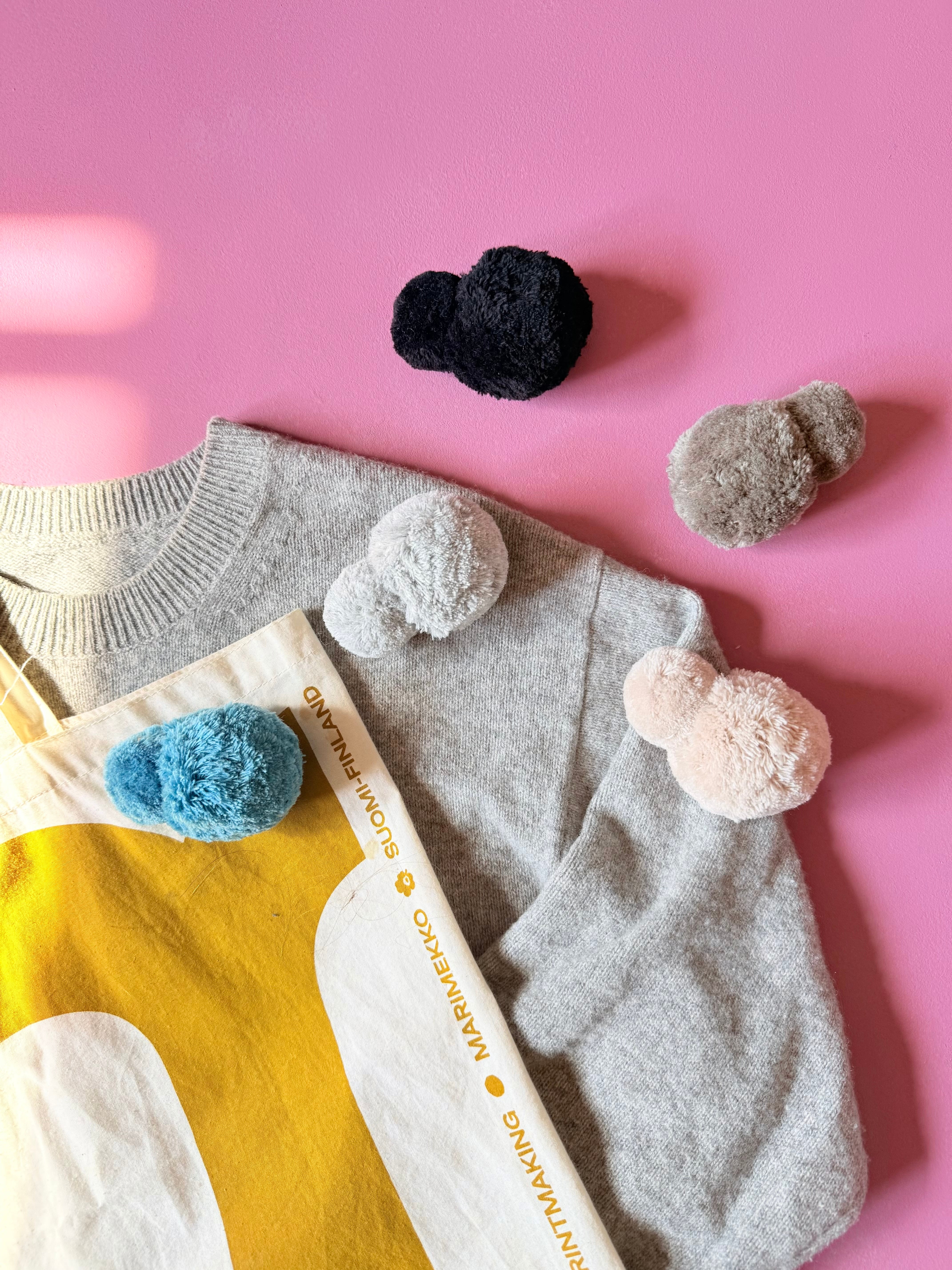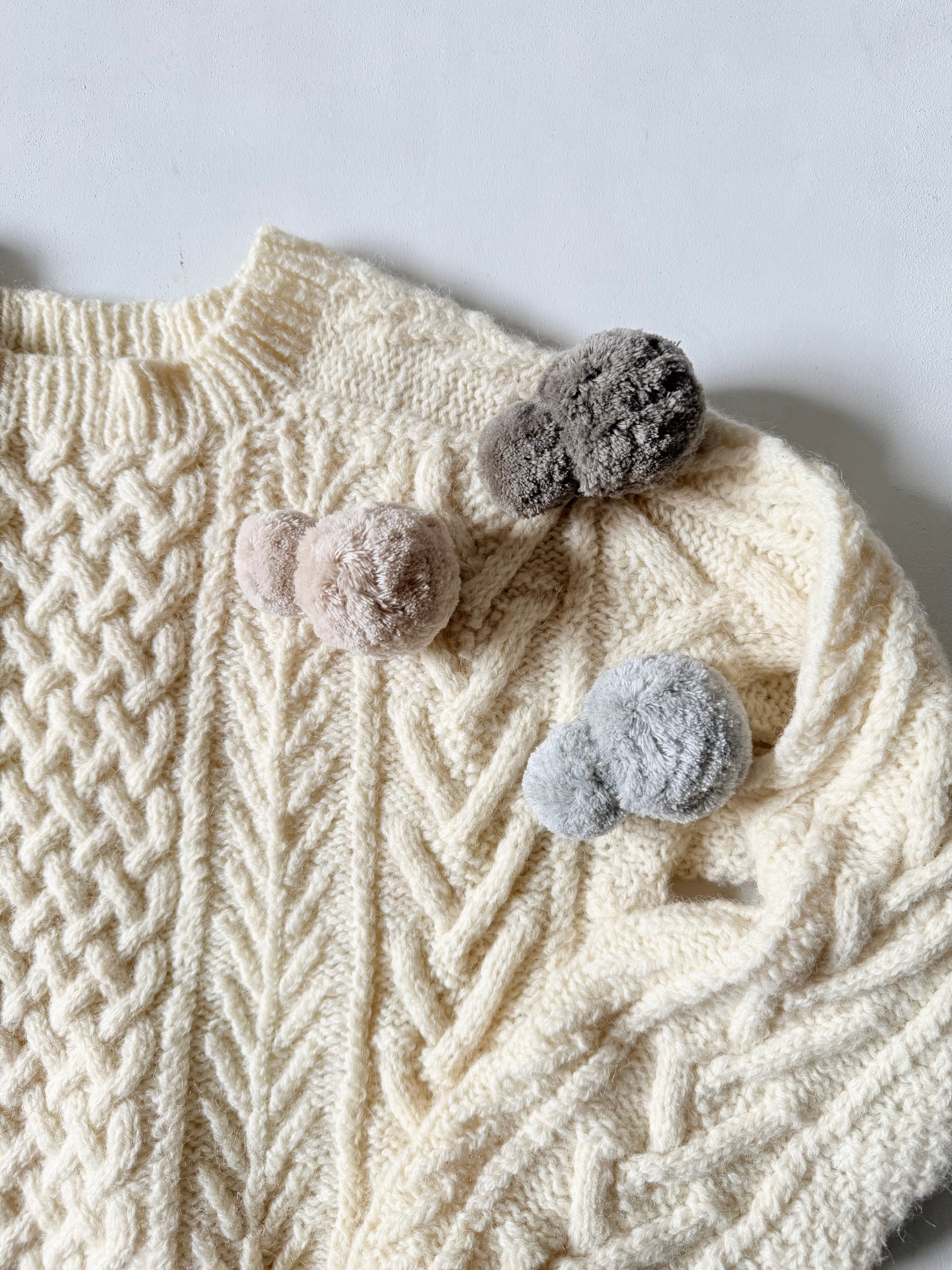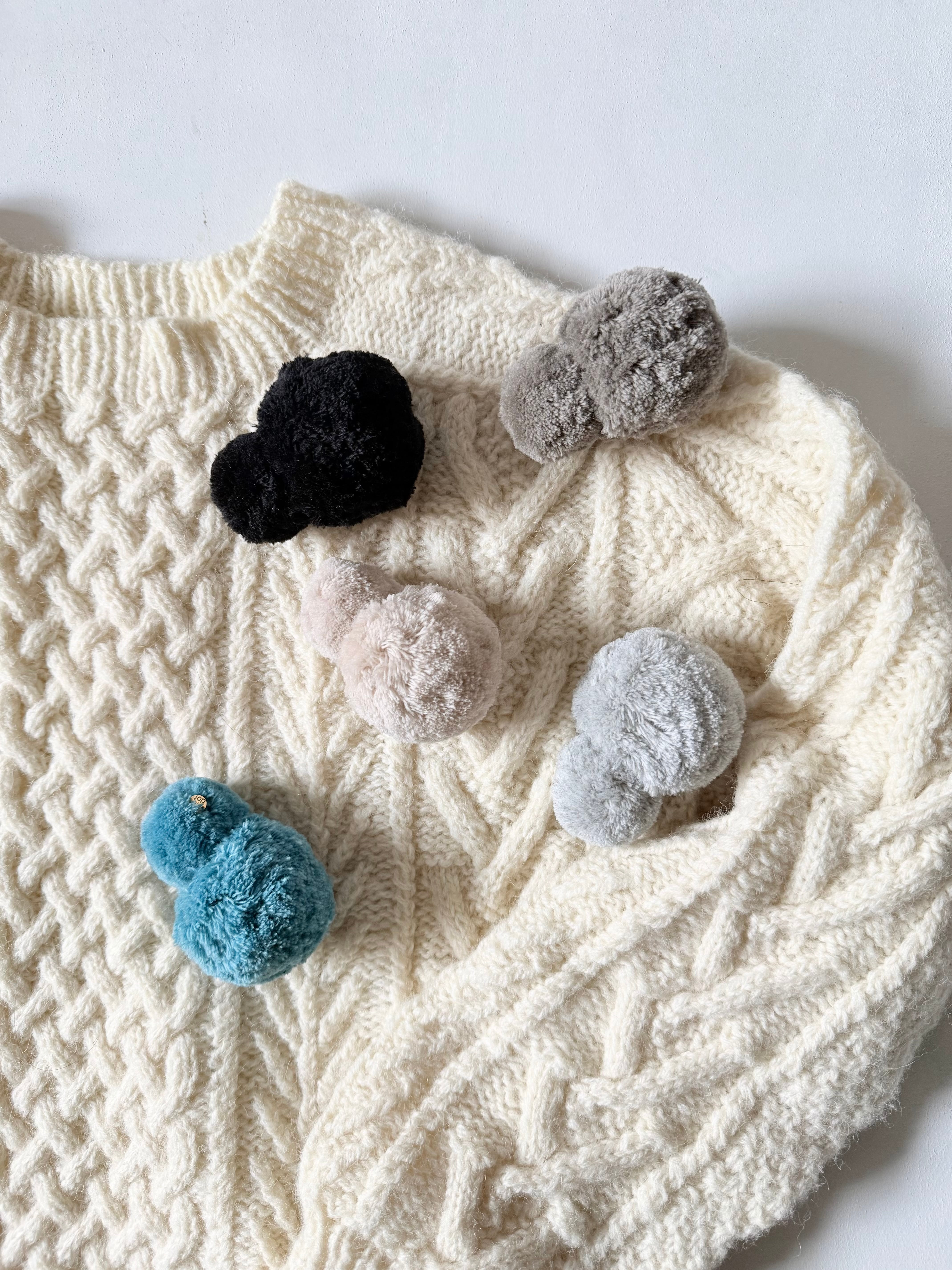毛糸で作った大きなポンポンと小さなポンポンを、組み合わせたかわいいカタチのブローチです。モコモコしたぬいぐるみのような愛らしさがあります。肩や胸につけていっしょにお出かけください。