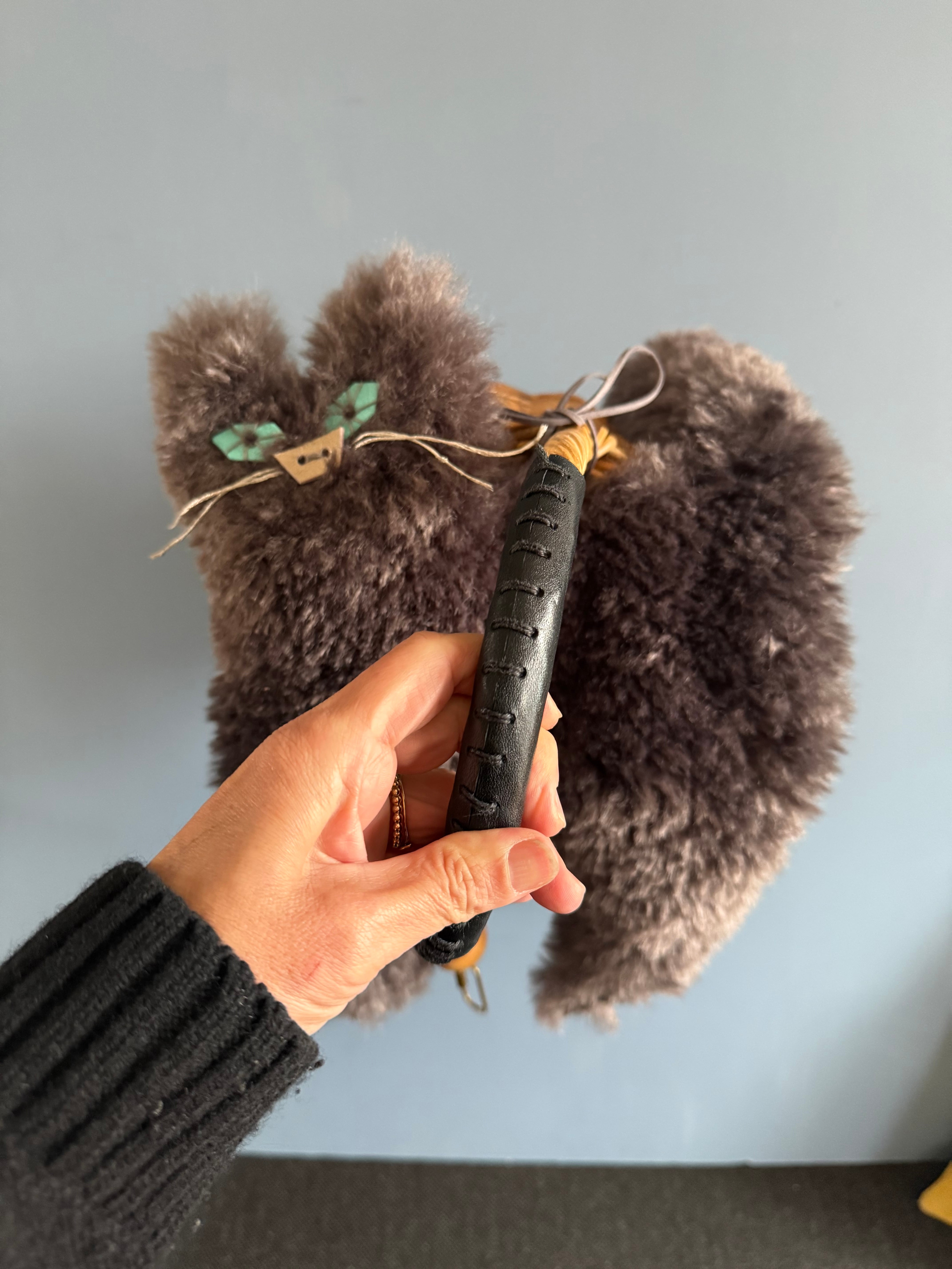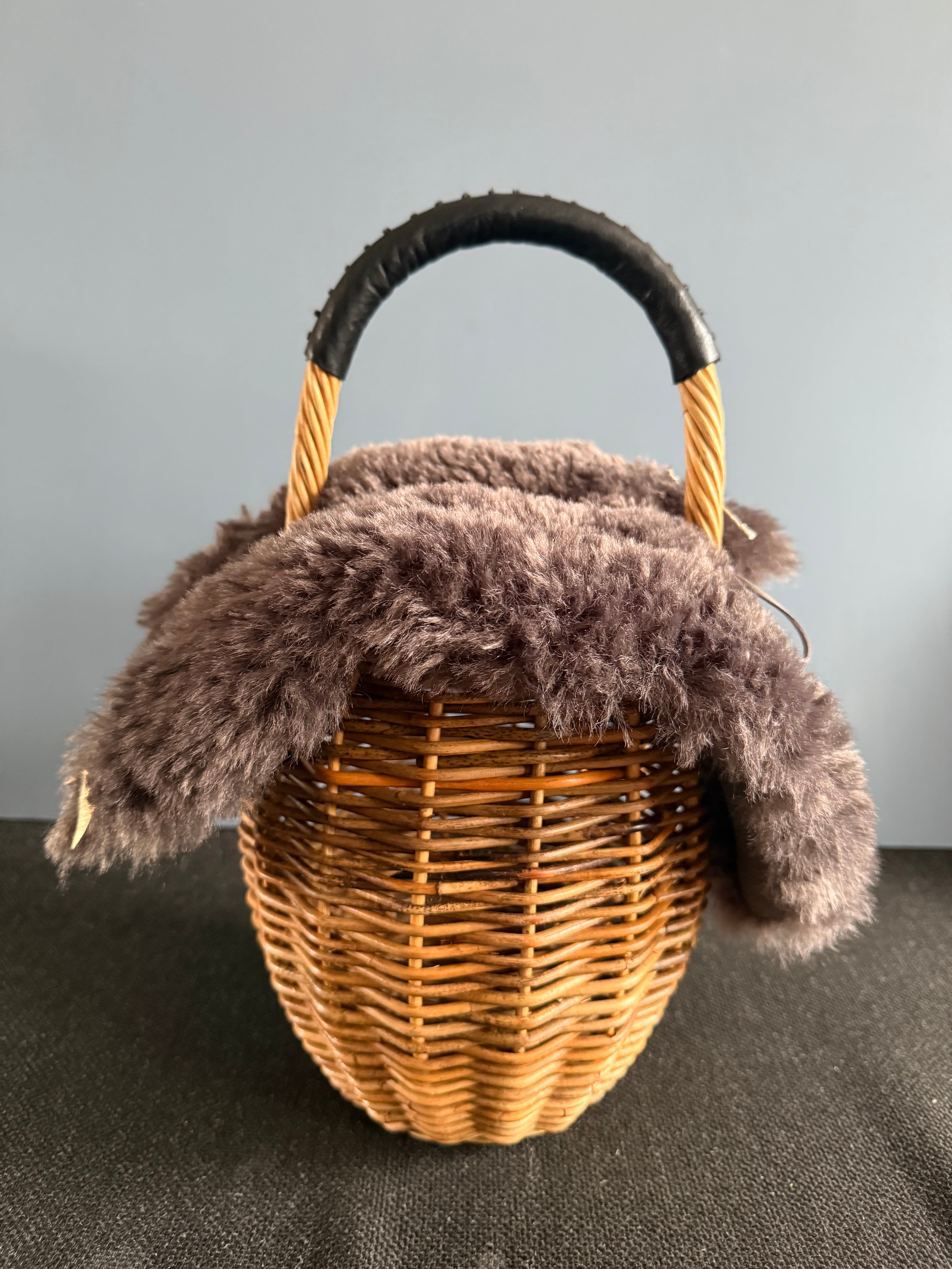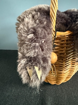 ダークグレーのもこもこヘアーがかわいい「ふわふわねこちゃん」です。このセットは、dot to dotオリジナルどんぐりバスケットの上にかぶせて使うカバーです。
