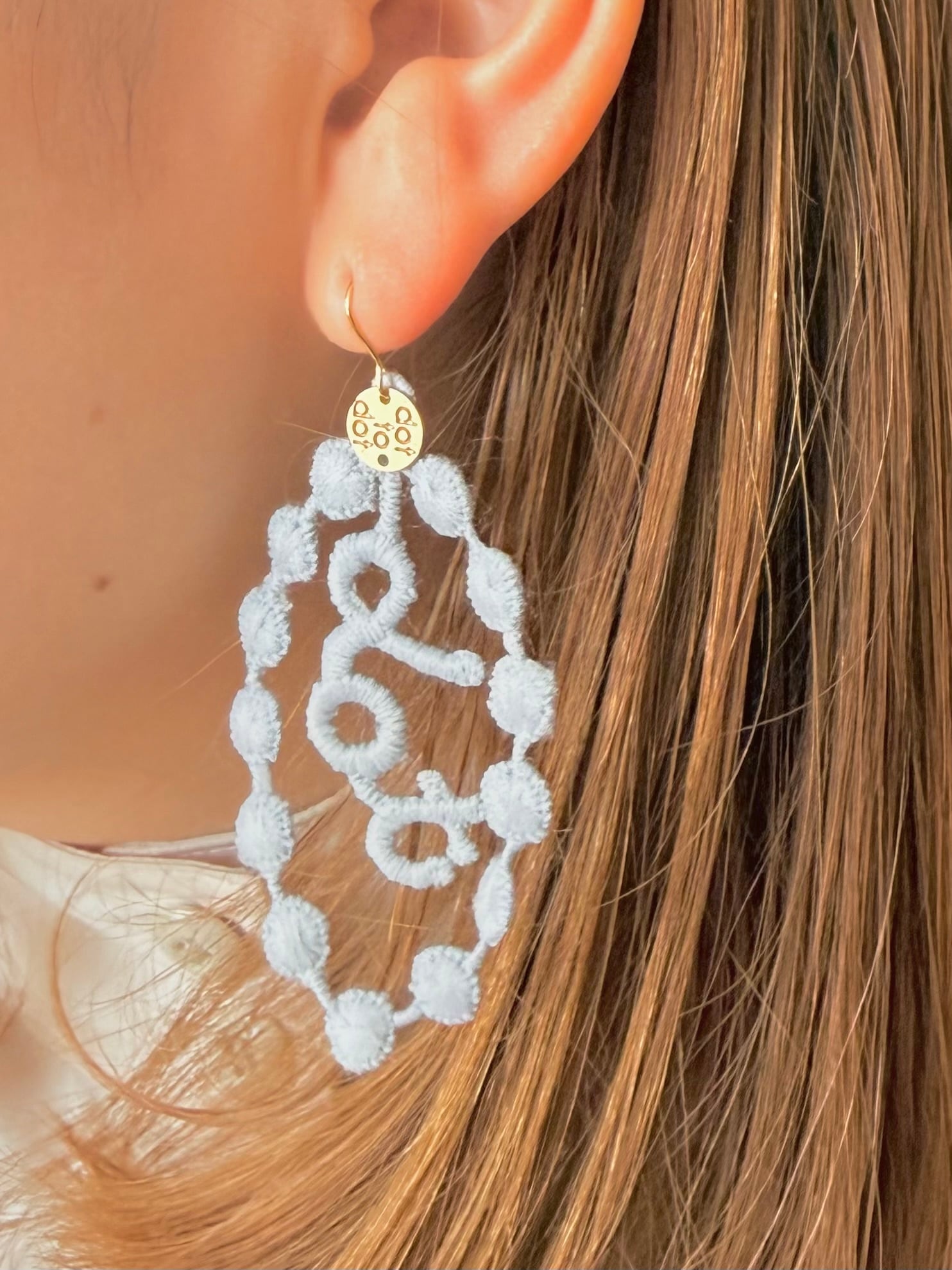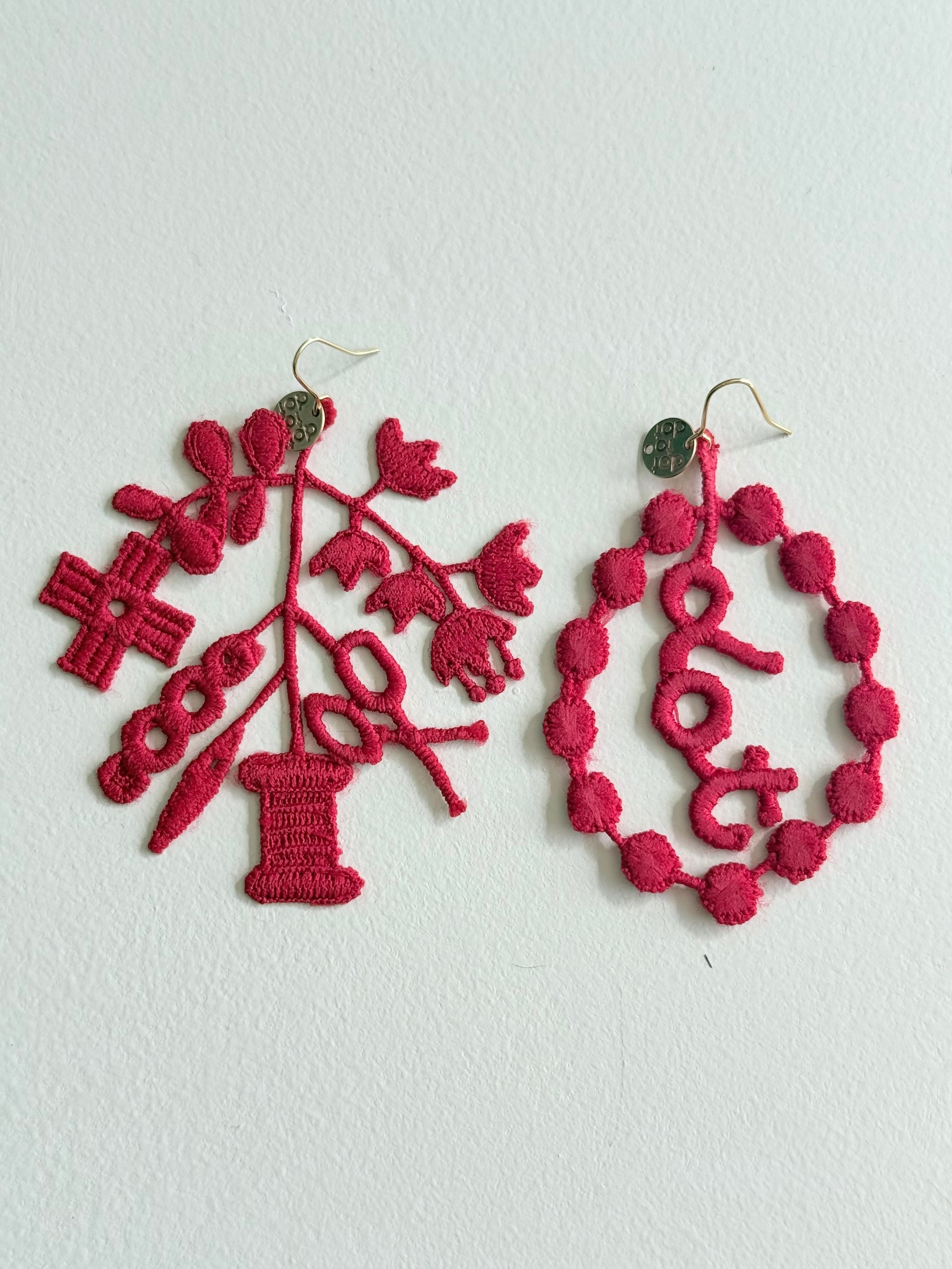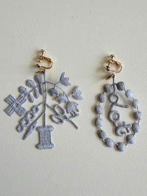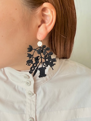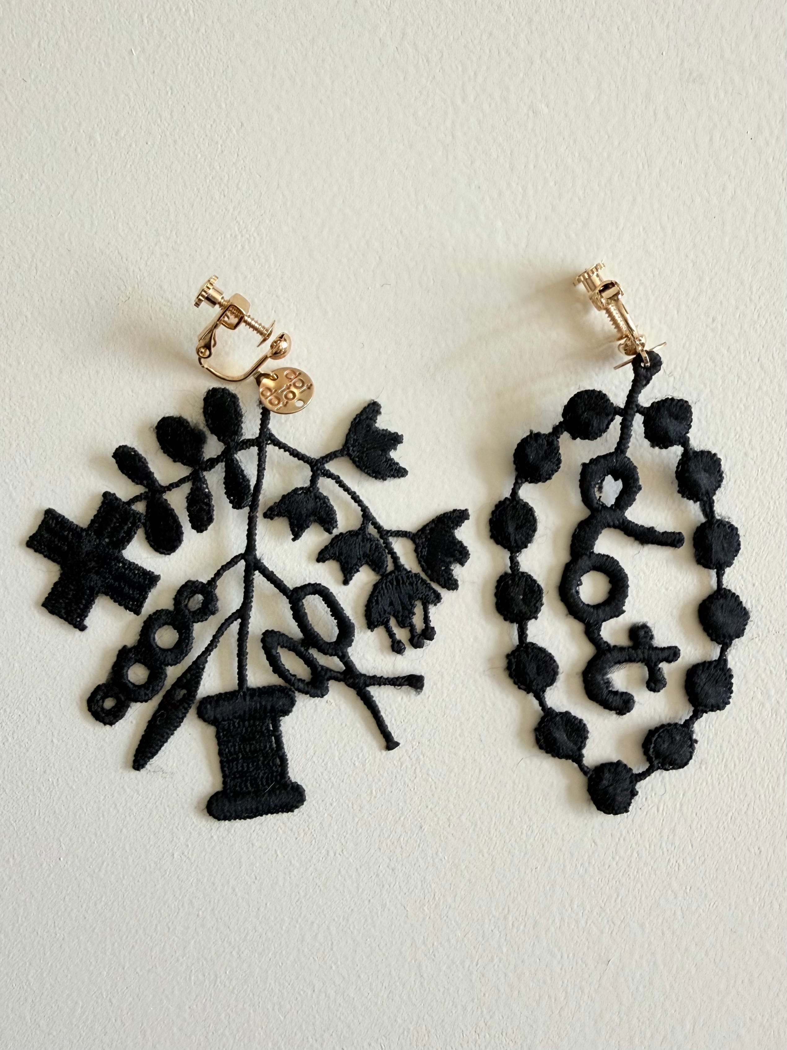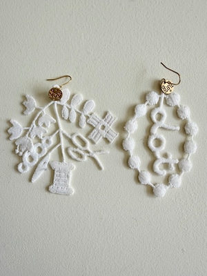 堀川波オリジナルイラストをレースに仕上げました。お裁縫道具をモチーフにしたものには、ハサミ、針、糸、お花がぶら下がっています。