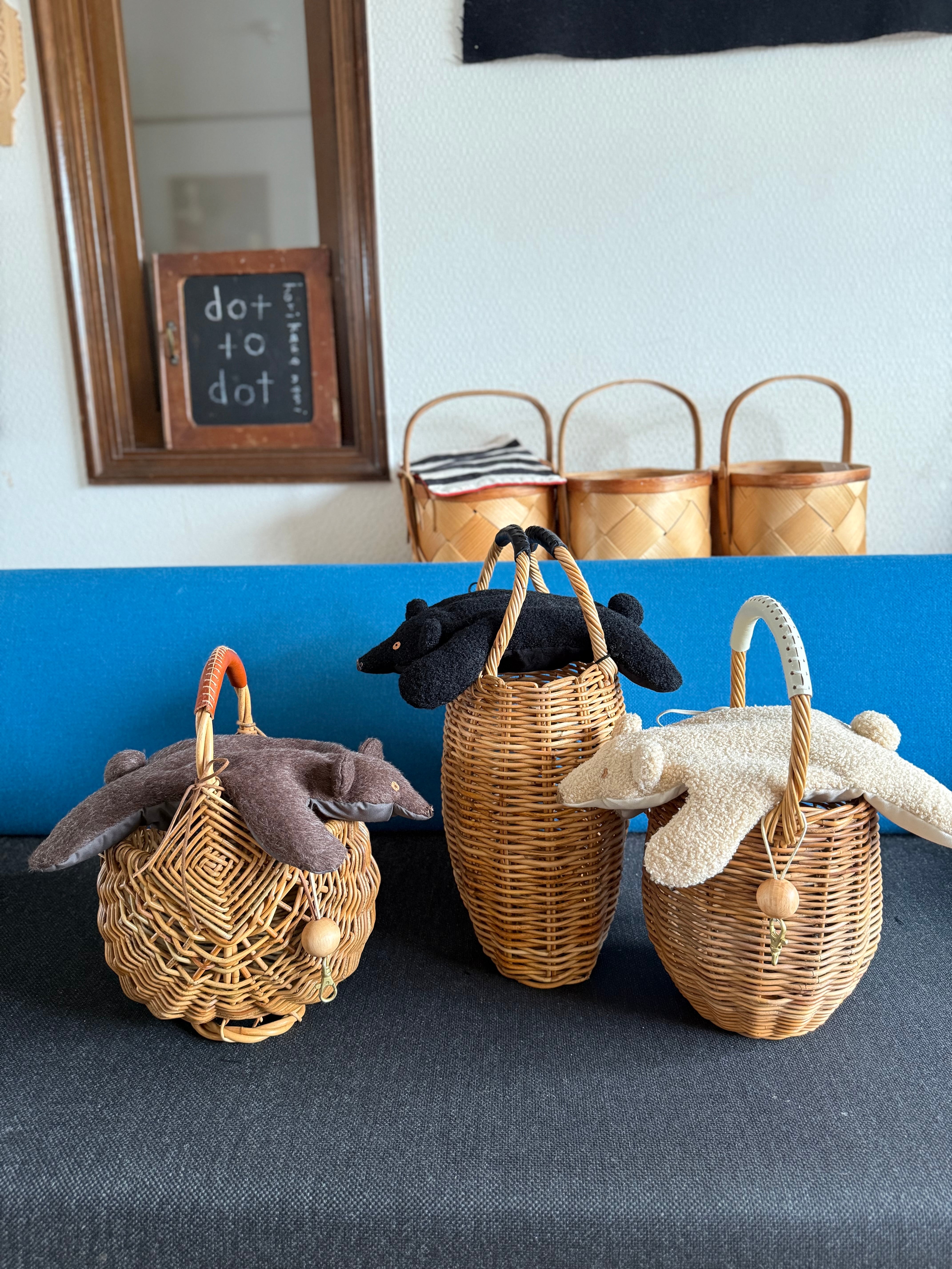 可愛らしい「もこもこくまちゃん」です。このセットは、dot to dotオリジナルどんぐりバスケットの上にちょこんと乗せられるくまちゃんのフタが特徴で、おでかけの際の癒しの存在としても最適です。ふんわりとした触り心地と愛らしい表情は、見る人を優しく包み込みます。お部屋に飾ることで、さらに温かい雰囲気を演出してくれます。
