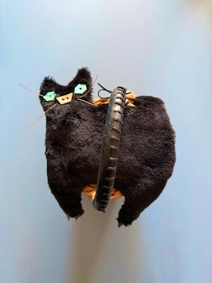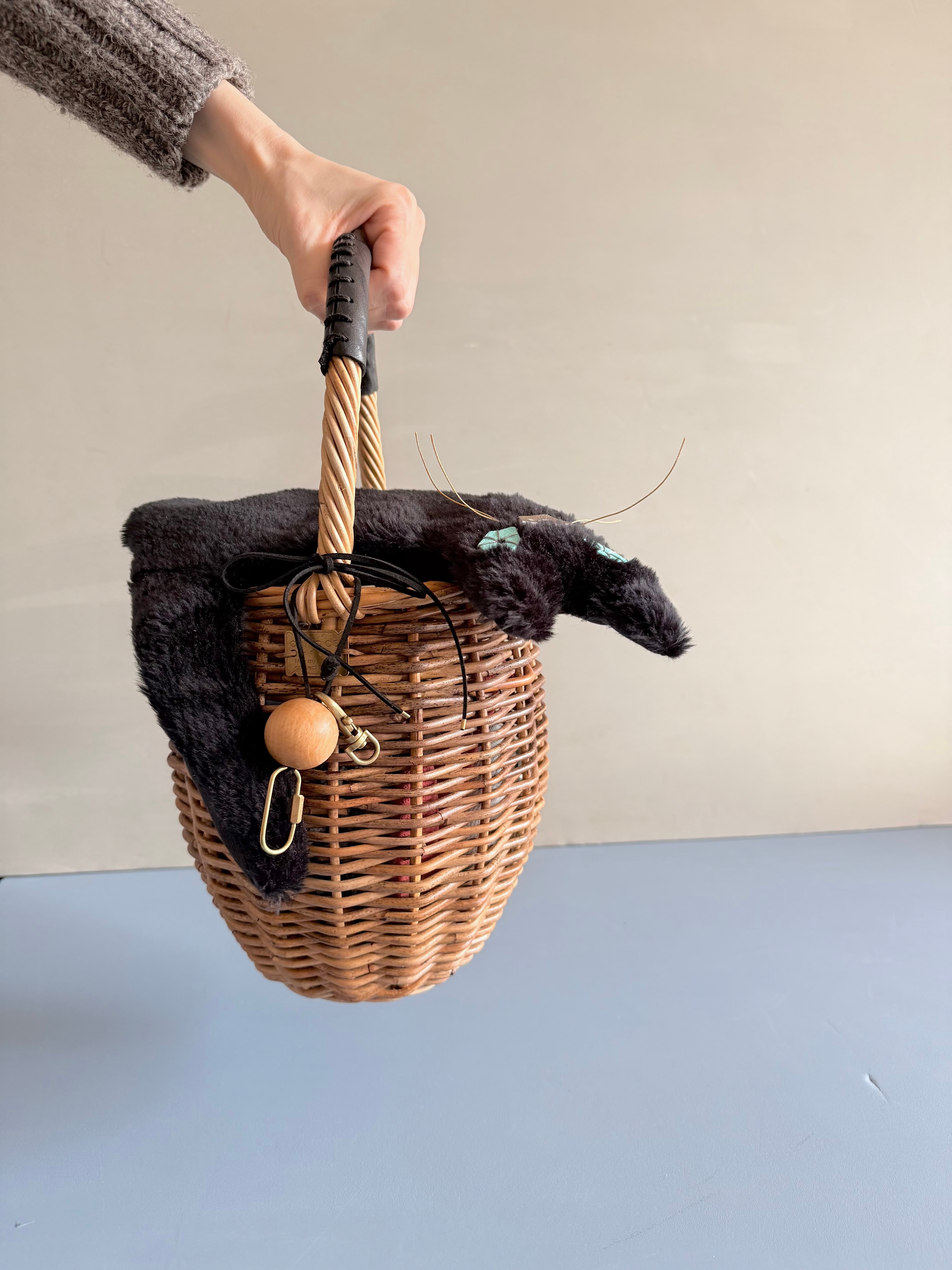 黒猫のバスケットカバー。堀川波がひとつひとつ革で作ったパーツを縫い付け、チャーミングなお顔に仕上げています。