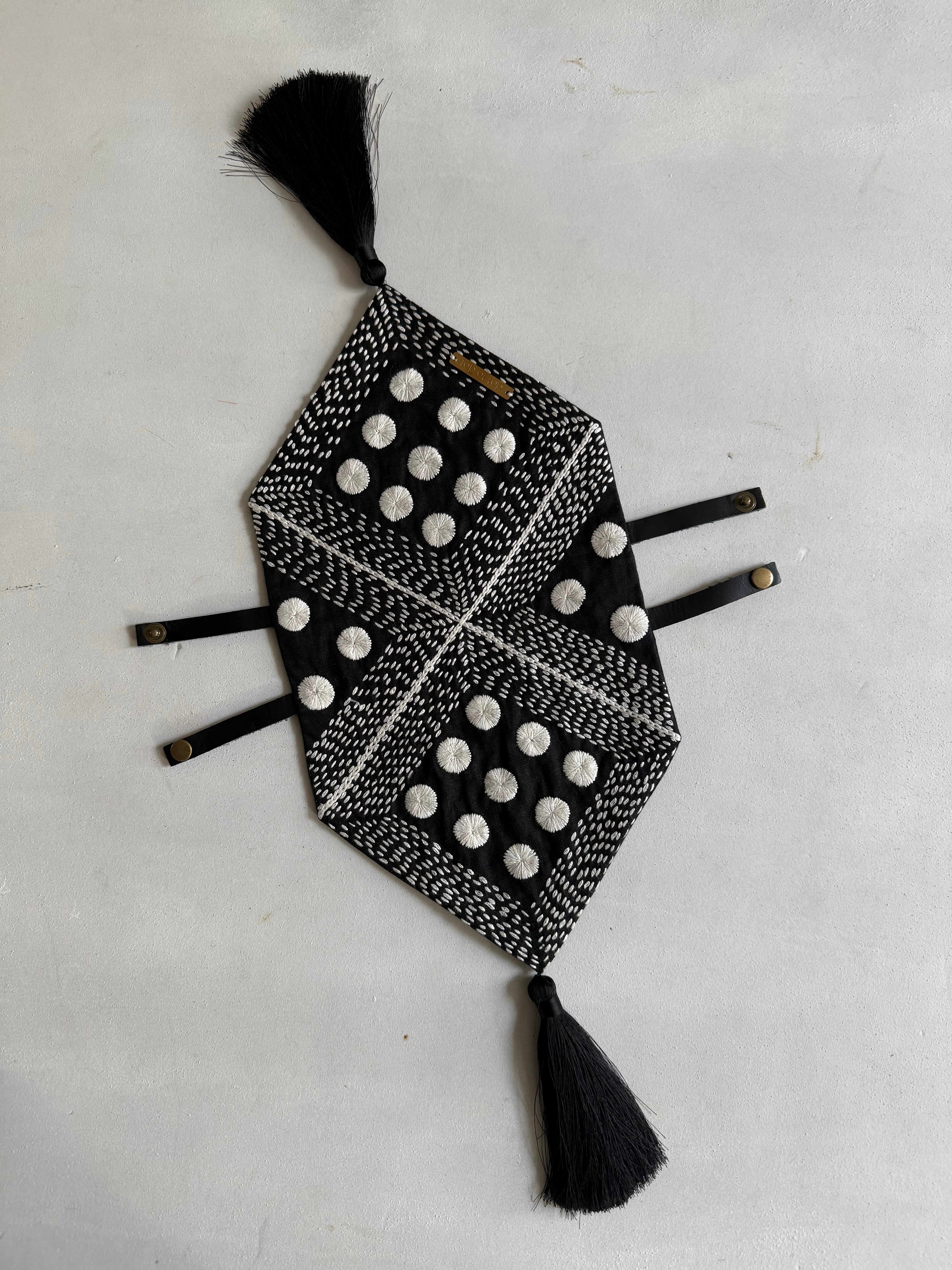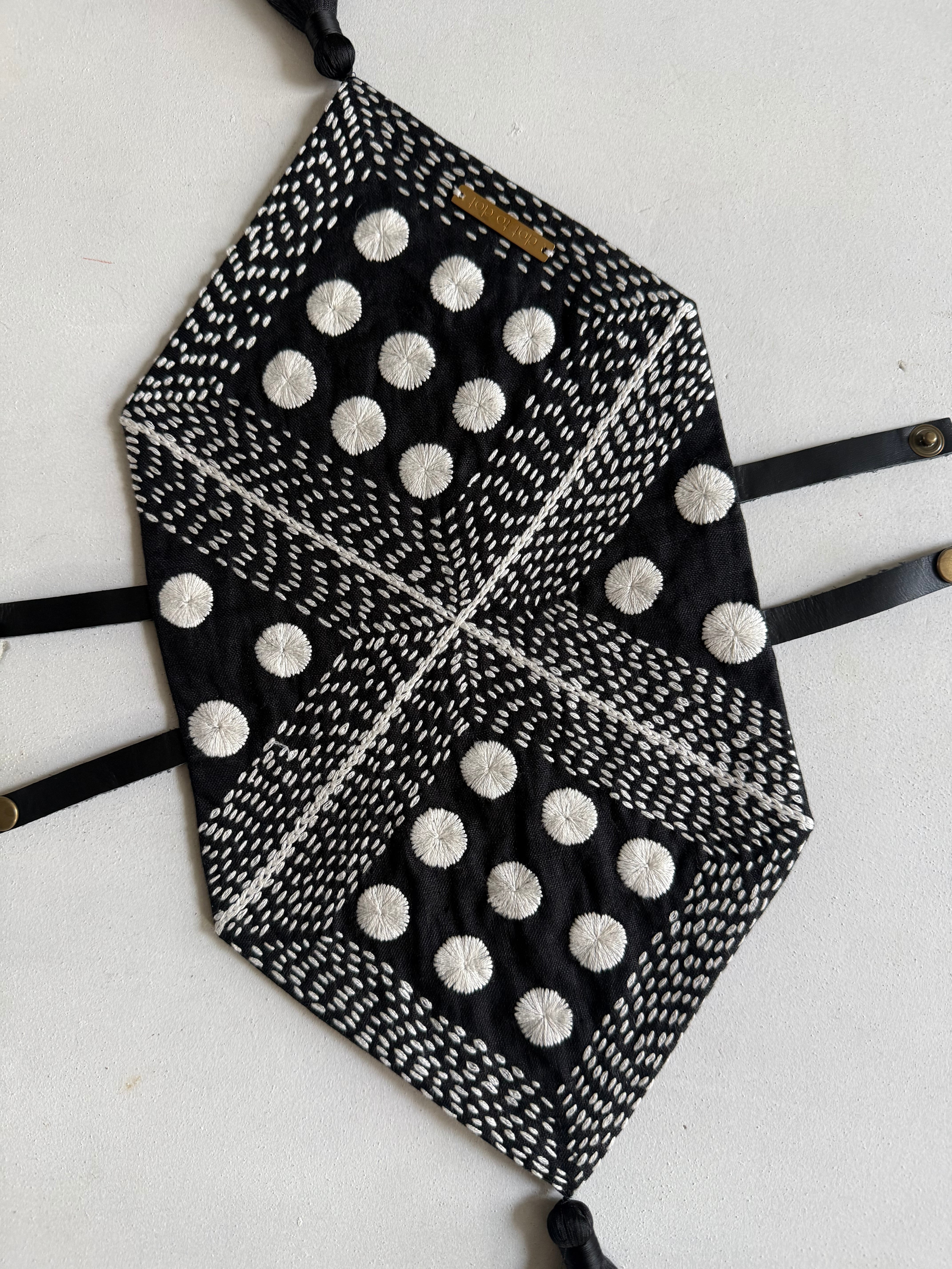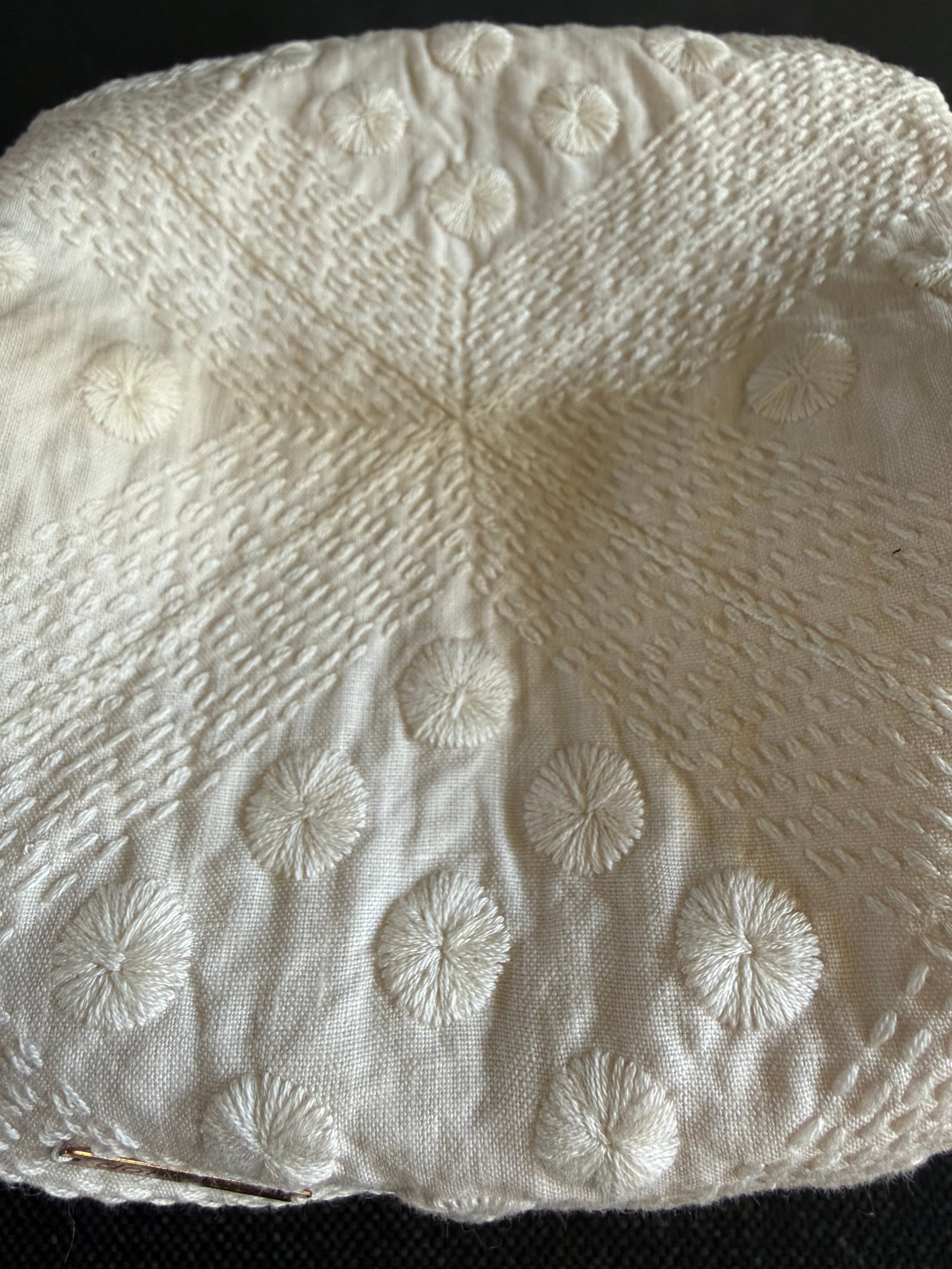 堀川波の刺し子ステッチの象徴とも言える定番柄が『バラとリンゴの庭』です。ひとはり、ひとはり、手刺繍でブラックリネンに刺し子ステッチが施されています。